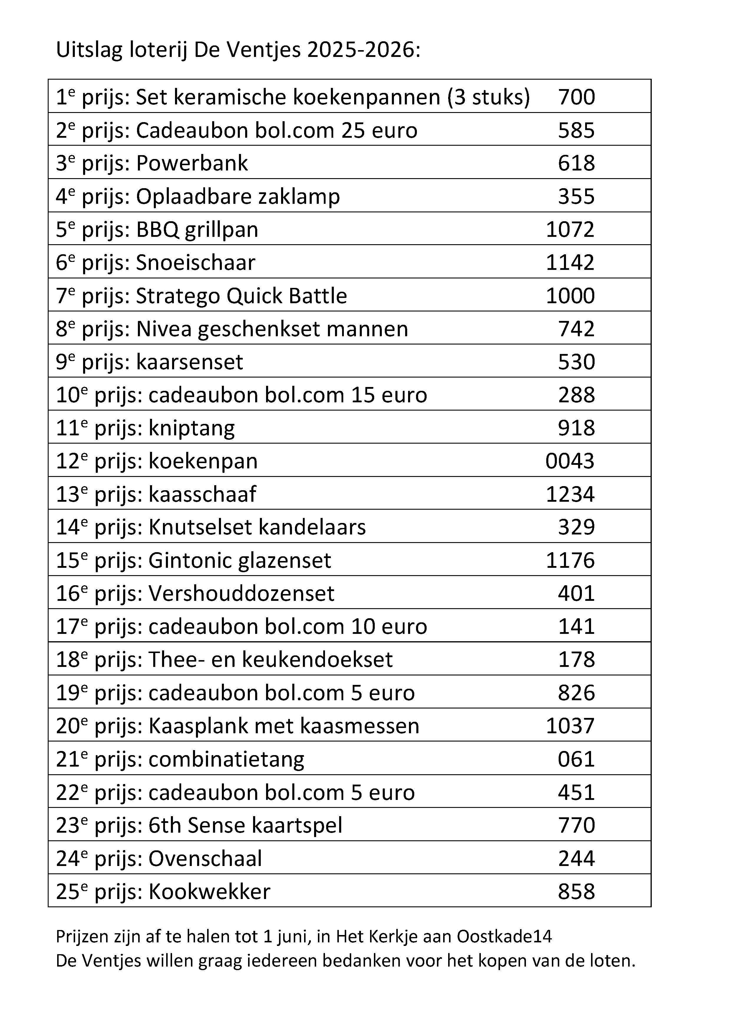 Uitslag loterij De Ventjes 2025-2026
